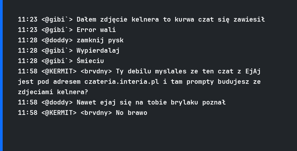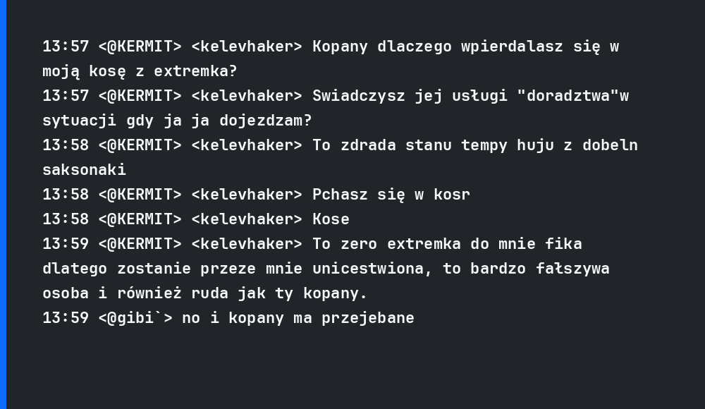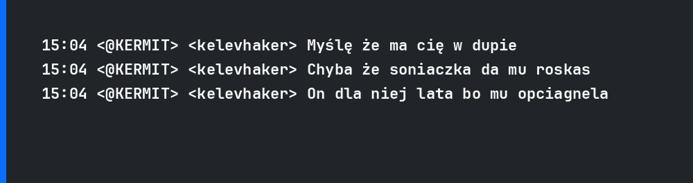15:04 <@KERMIT> <kelevhaker> Myślę że ma cię w dupie