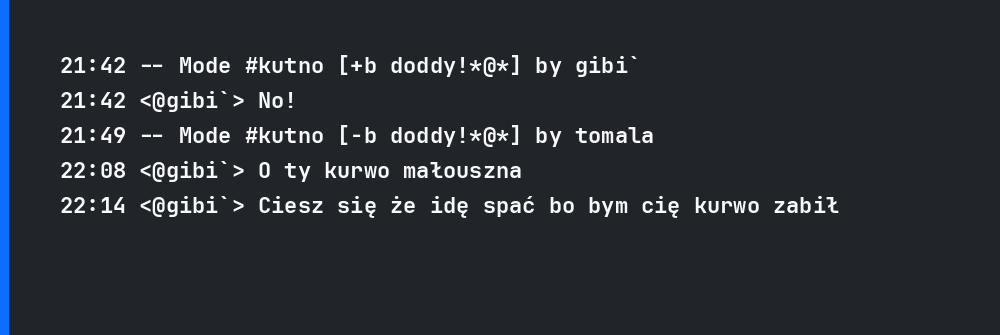 14:16 -- Mode #kutno [+b admy!*@*] by gibi` 14:16 <-- Tempak has kicked admy (banned by gibi`: admy!*@*) 14:16 --> ay ((.)Y(.)) (admy@fishy.ulegend.net) has joined #kutno 14:16 <ay> odpierdol sie ode mnie chory na glowe xmenie 14:16 <ay> bo jak mi sie zachce to cie dojade w koncu 14:16 <ay> a tego nie chcesz 14:17 <ay> pozmieniam ci passy i piny wszedzie, nawet w bramie garazowej :F 14:17 <ay> do chaty nie wejdziesz betonie