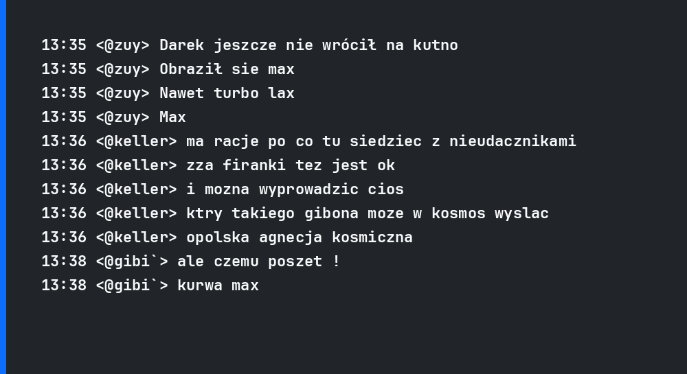 13:32 <@gibi`> długo darek zeznaje 13:35 <@zuy> Musi mieć niezłe haki 13:36 <@gibi`> nom 13:49 <@KERMIT> <brvdny> On jeszcze skrinszoty kredkami rysuje 13:50 <@KERMIT> <brvdny> Na A4 naturalnie 13:54 <@zuy> Świecowymi 13:54 <@zuy> Noe trzeba temperować 13:55 <@gibi`> On by się strugaczkom zabił przecież